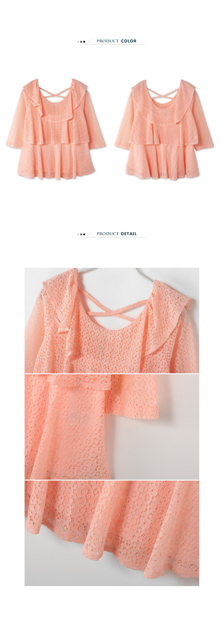 肩上拼接鏤空蕾絲使妳散發甜美氣質,收出腰身的設計再為穿搭注入優雅亮點