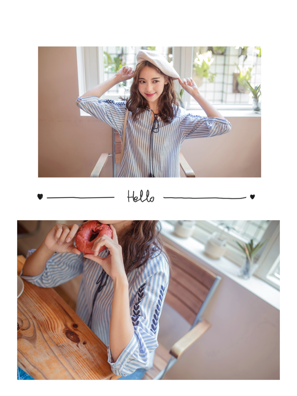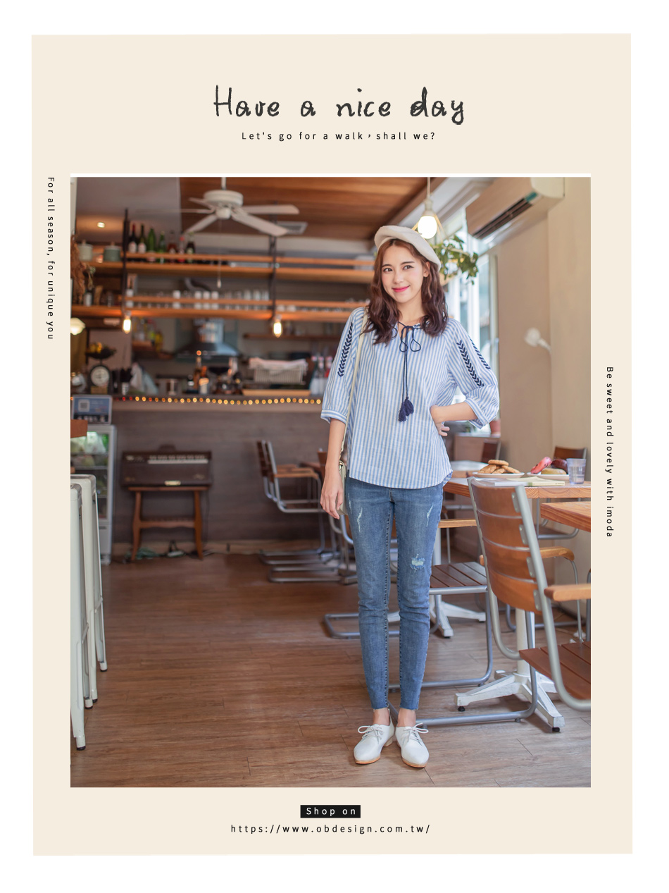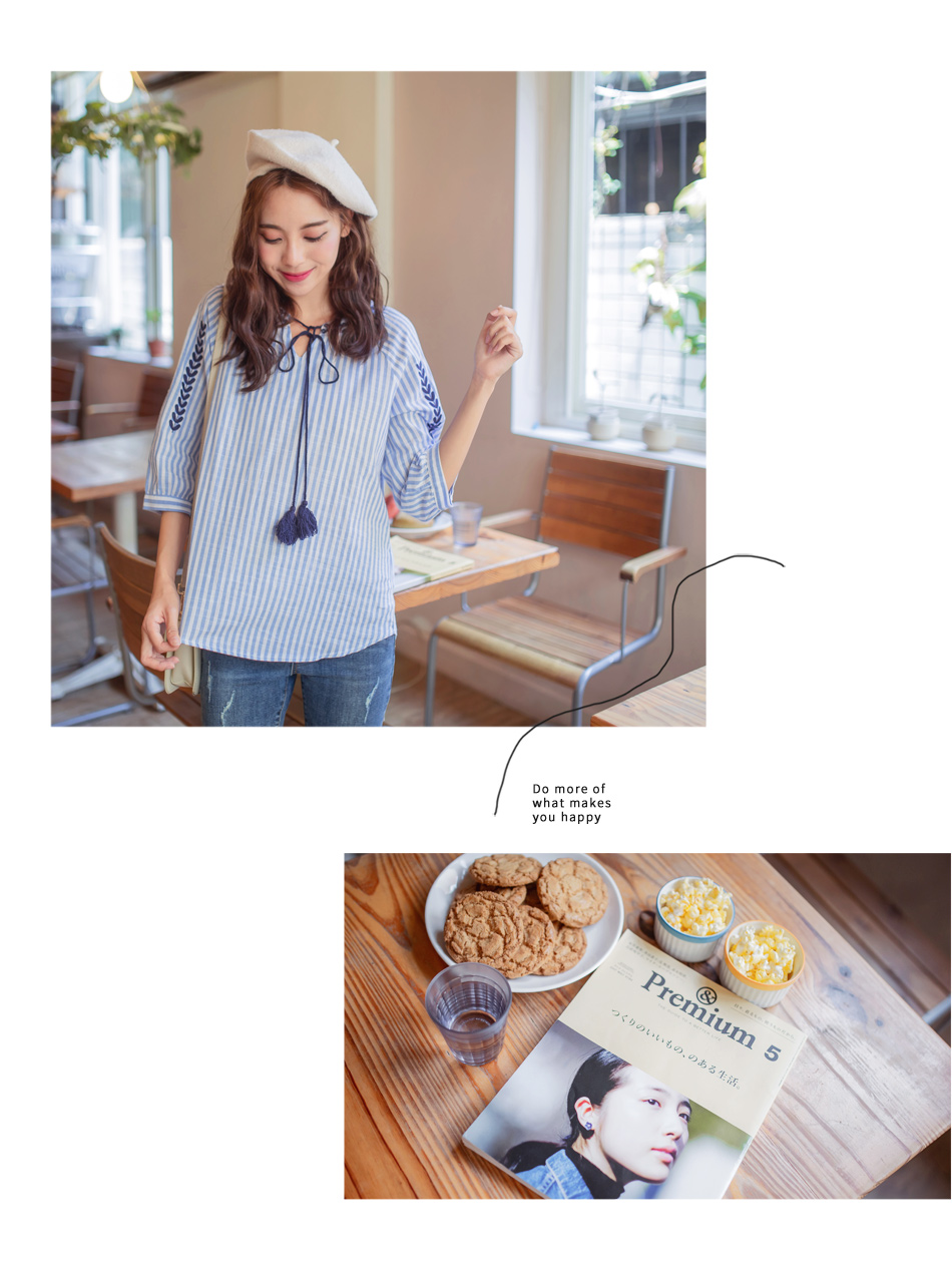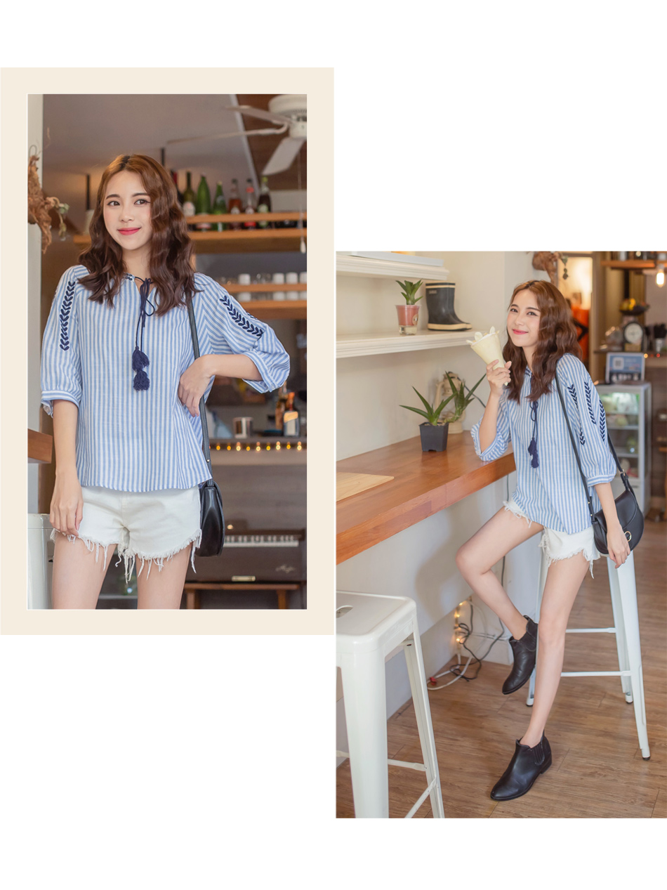 此款可與QA0701搭配親子裝喲! 胸前的流蘇綁帶設計, 增添迷人的波西米亞風格~ 藍色調的直條紋搭配刺繡點綴, 打造時髦有型穿著! ********************** 小提醒:綁帶可調 深 售價:469