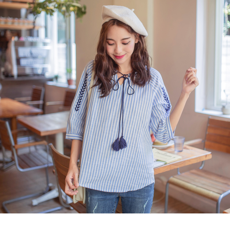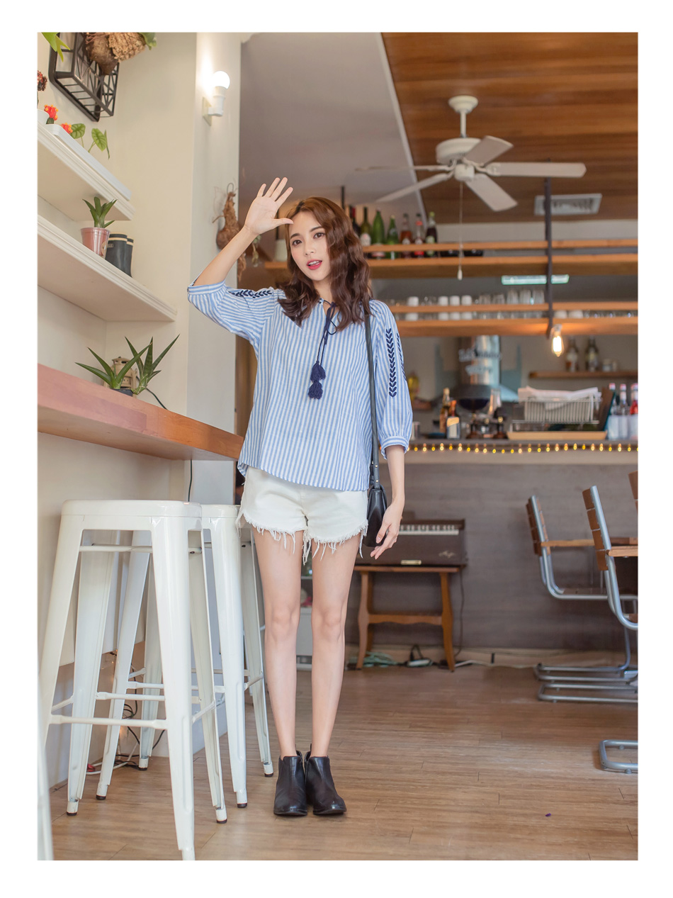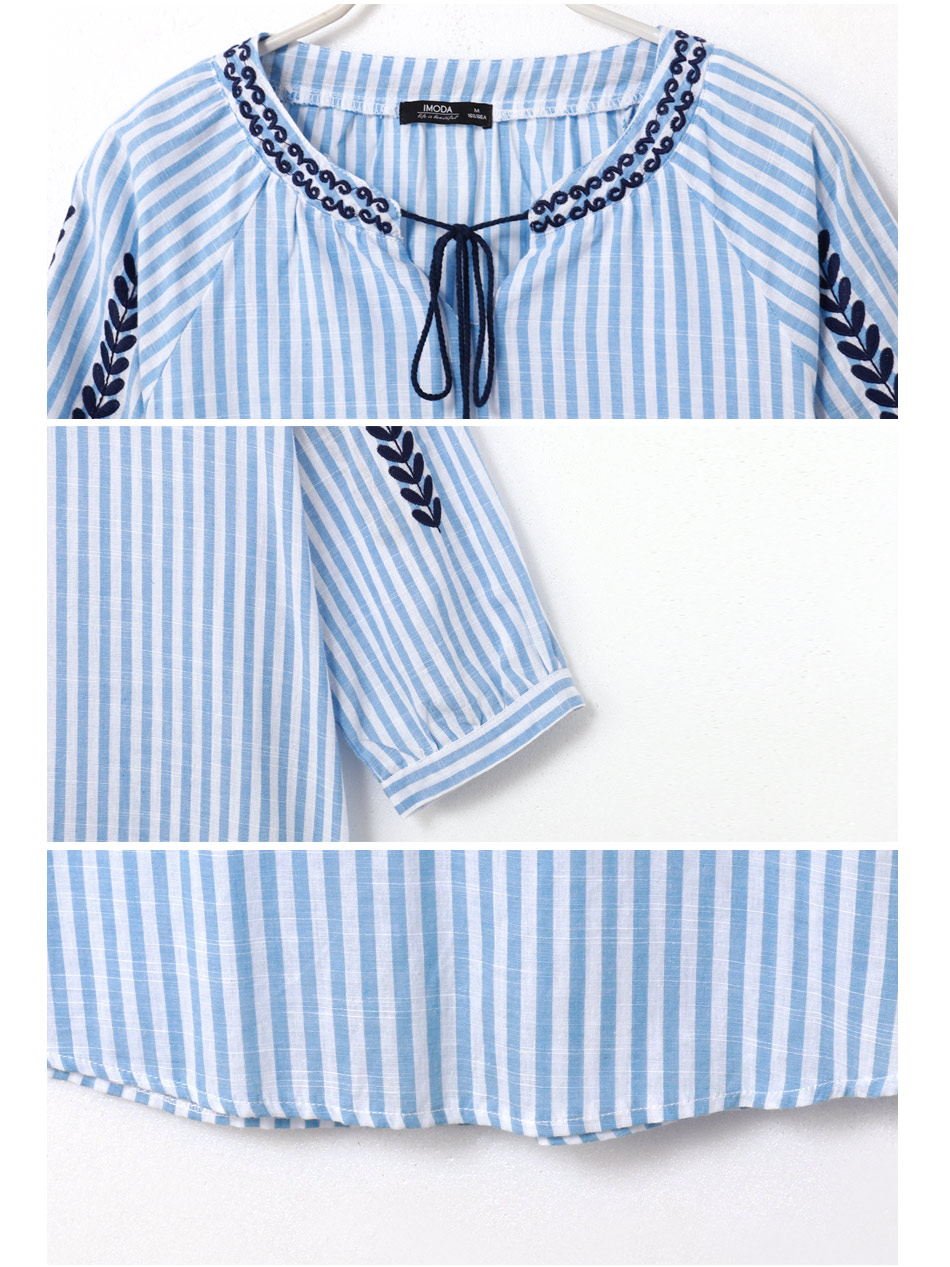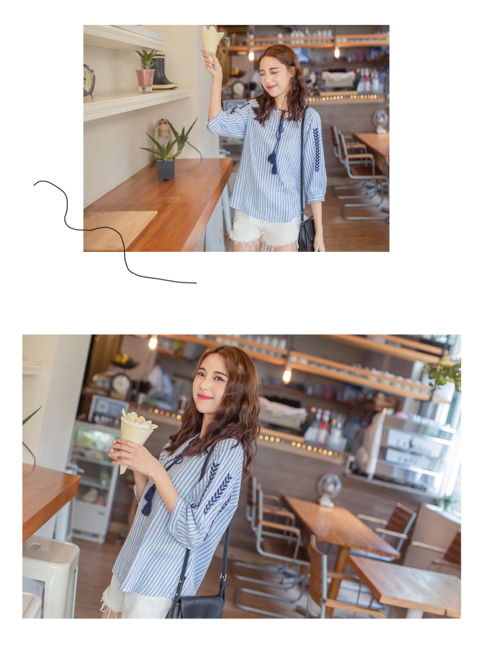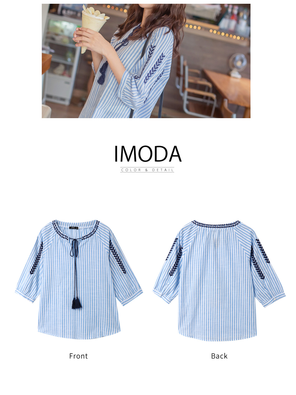 此款可與QA0701搭配親子裝喲! 胸前的流蘇綁帶設計, 增添迷人的波西米亞風格~ 藍色調的直條紋搭配刺繡點綴, 打造時髦有型穿著! ********************** 小提醒:綁帶可調 深 售價:469