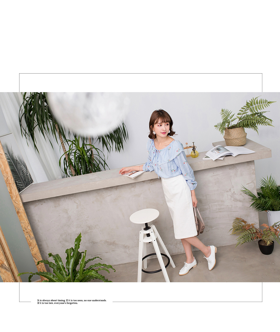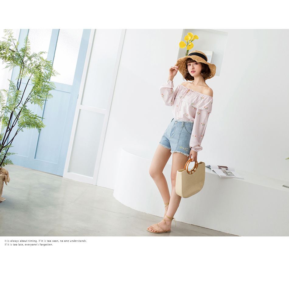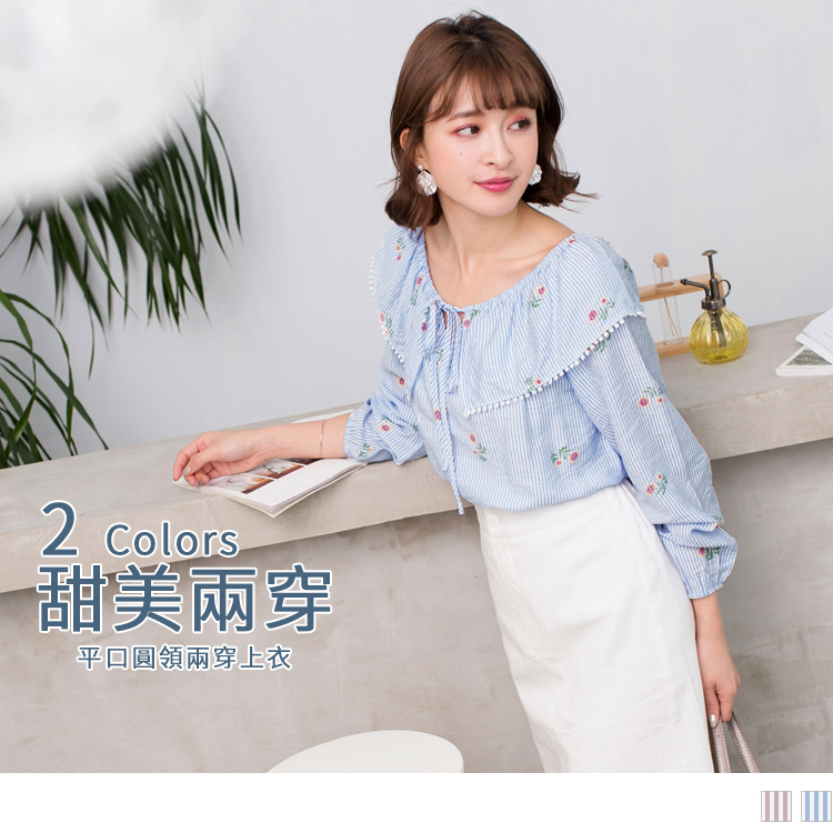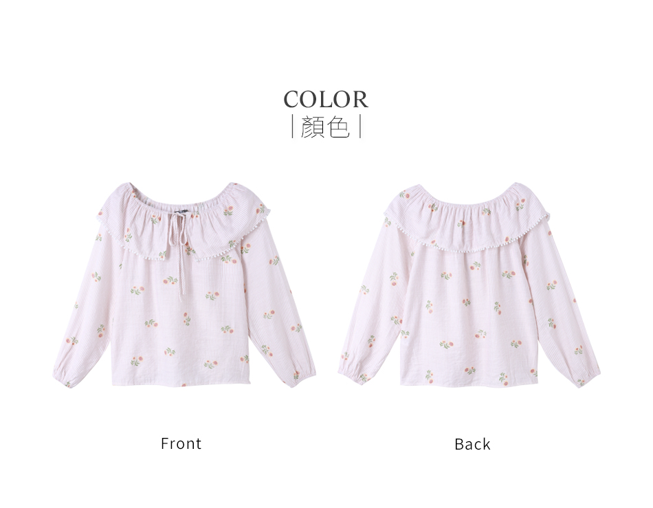 領口綴小棉球增添甜美感,且可以當圓領及一字領穿搭變換不同風格~