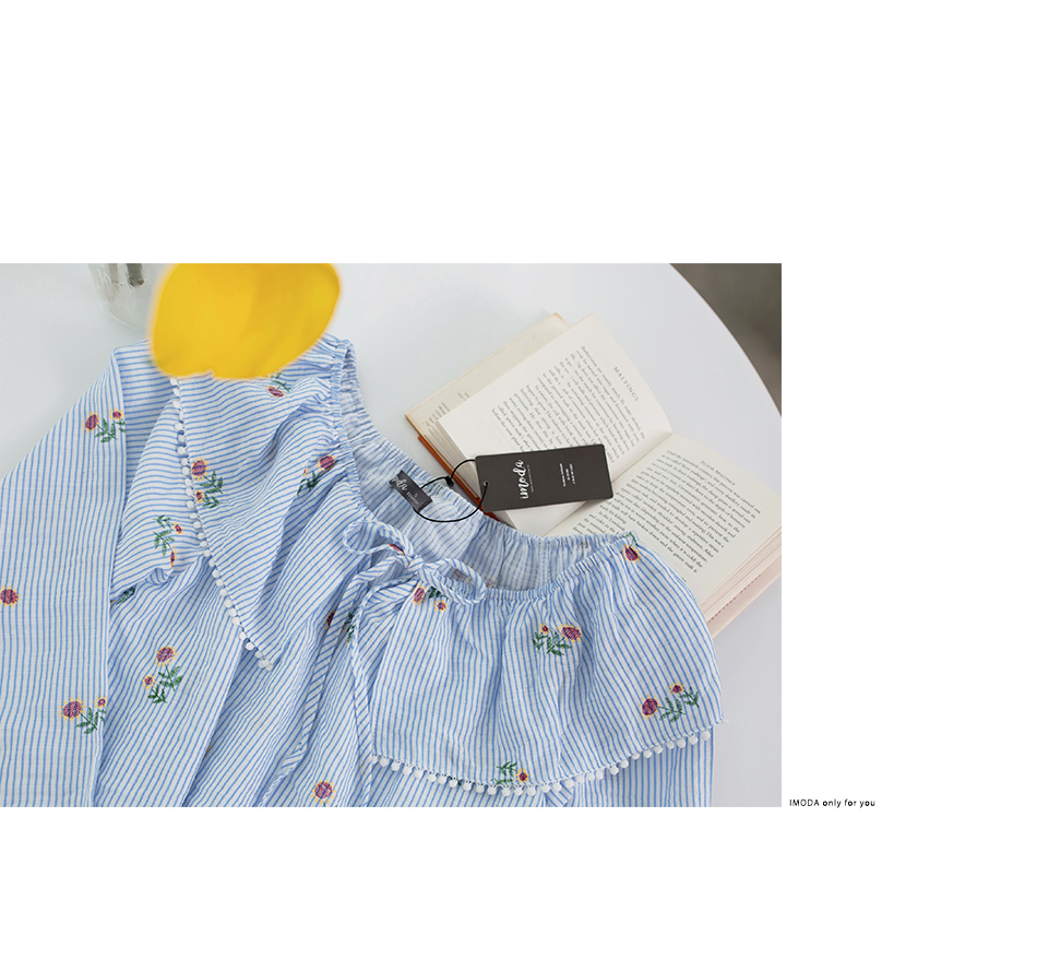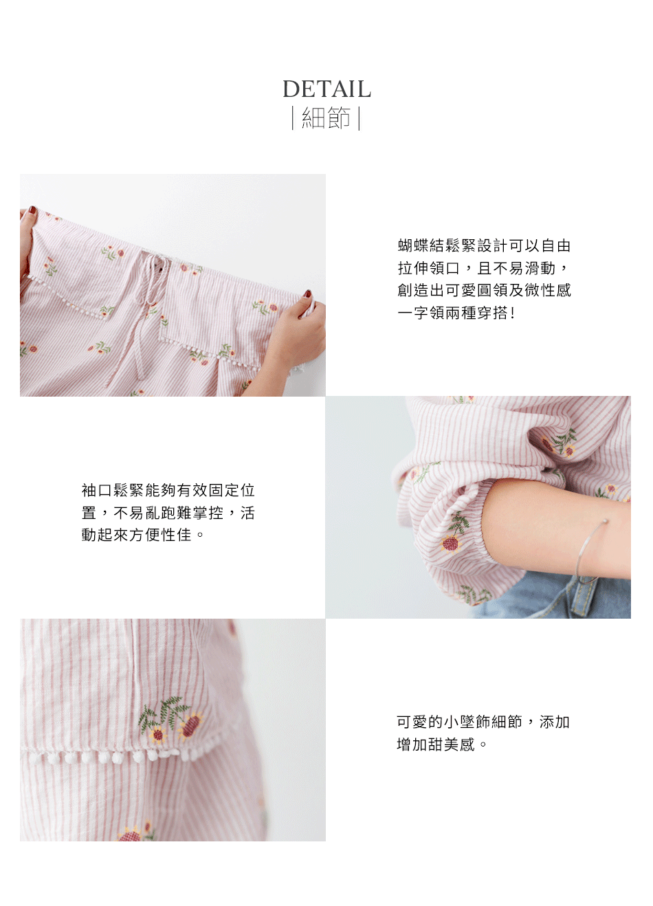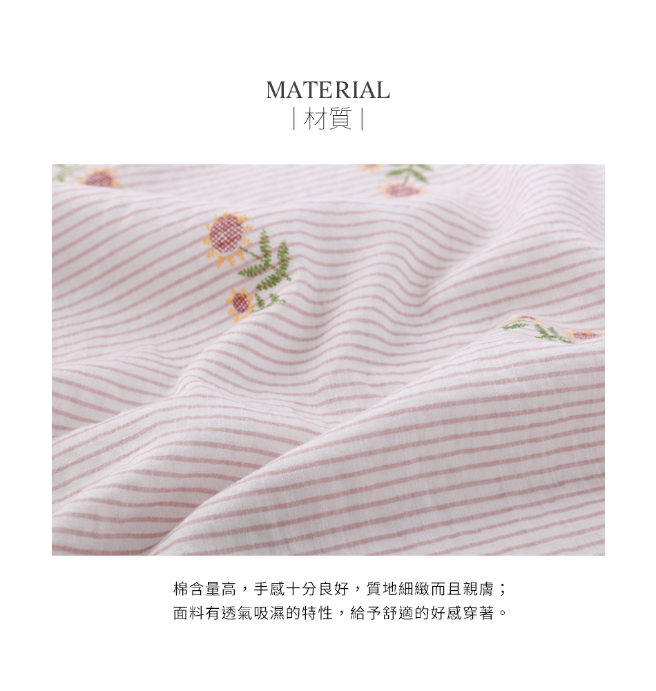 採用高含棉的面料搭配直條紋及向日葵刺繡,涼感親膚且時髦有型!