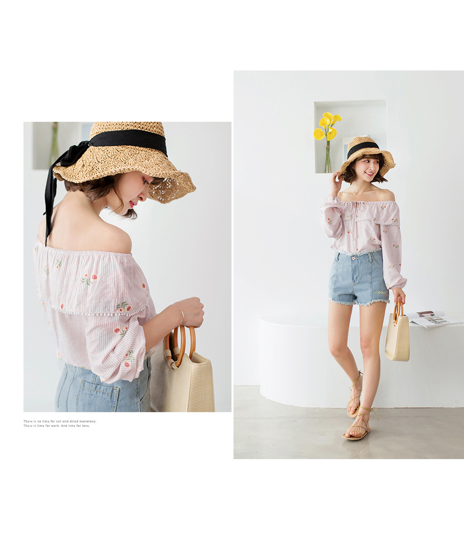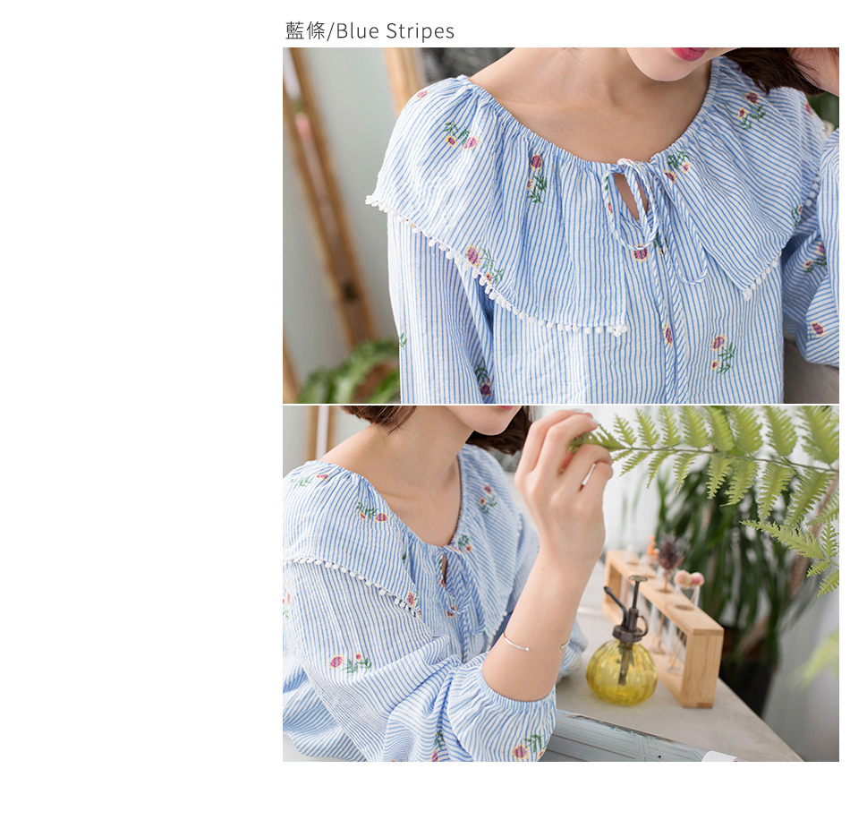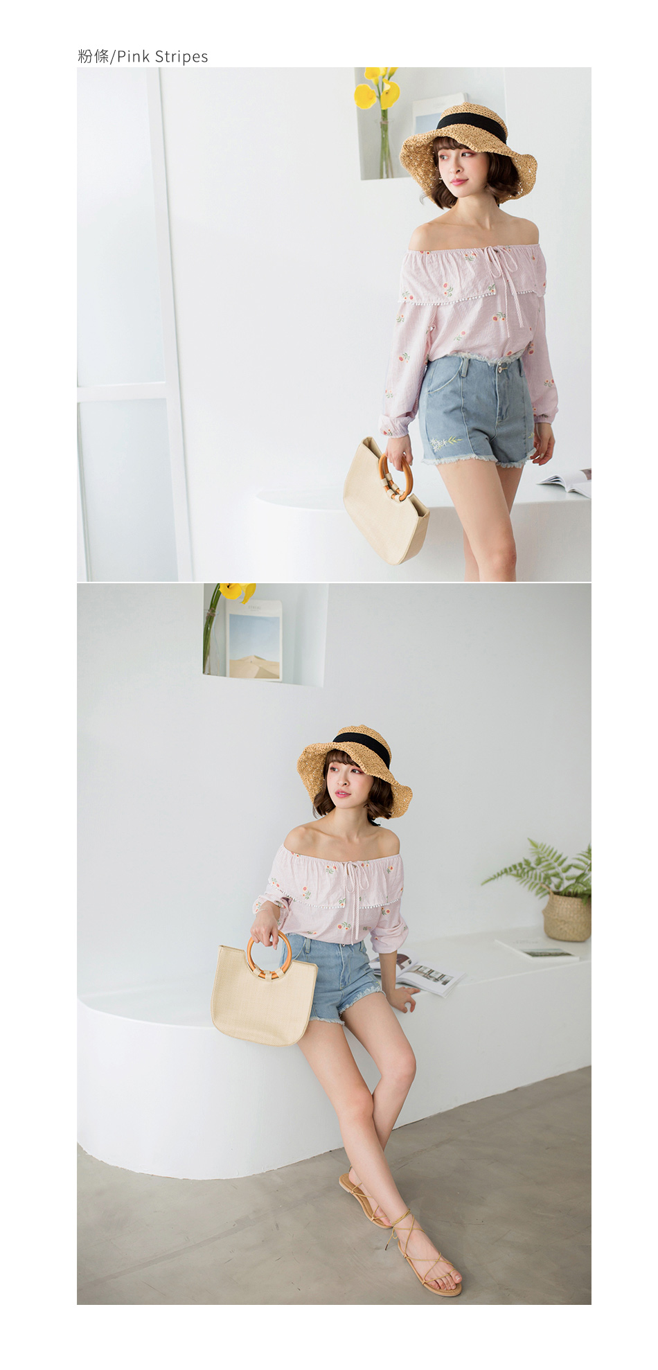 版型偏大 請依照個人喜愛的舒適度購買 領口綴小棉球增添甜美感,且可以當圓領及一字領穿搭變換不同風格~ 採用高含棉的面料搭配直條紋及向日葵刺繡,涼感親膚且時髦有型! ****************** 售價:399