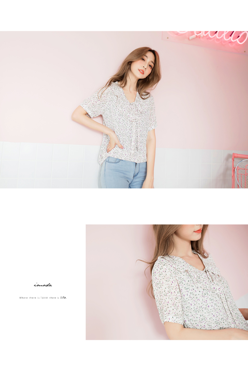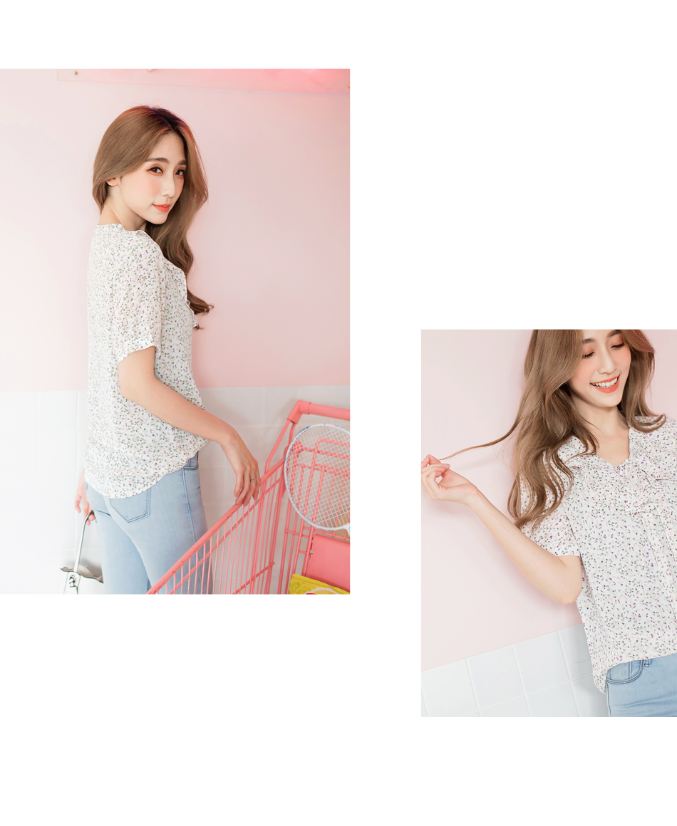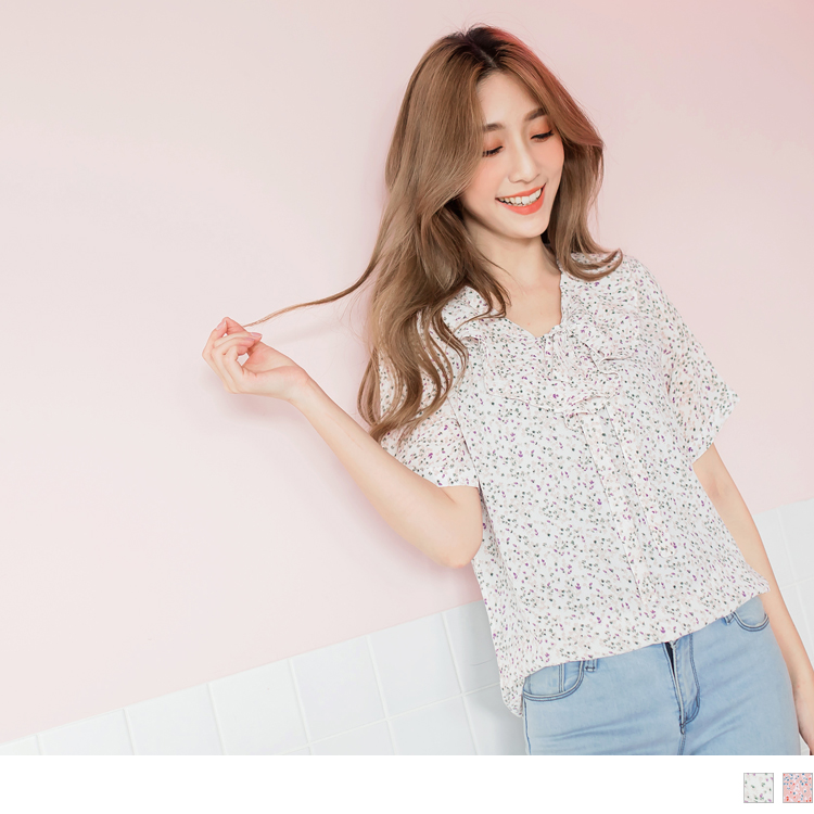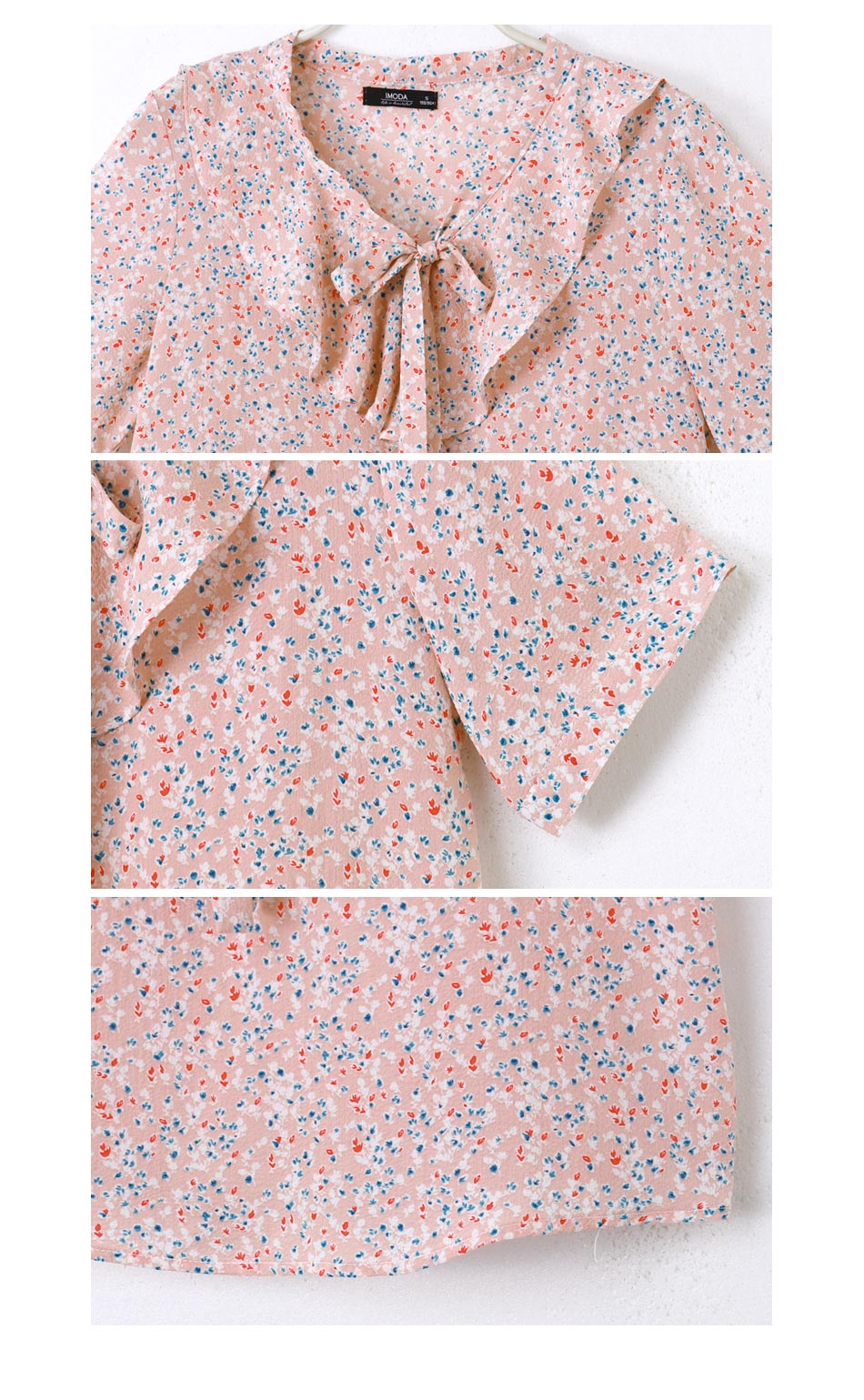 滿版碎花搭配雪紡面料, 展現飄逸感的清新甜美穿著~ 領結綁帶增添設計感, 領口的荷葉滾邊剪裁營造鄰家女孩氣息~ ********************** 小提醒:綁帶可調 深色衣物建議單獨洗滌,以 售價:369