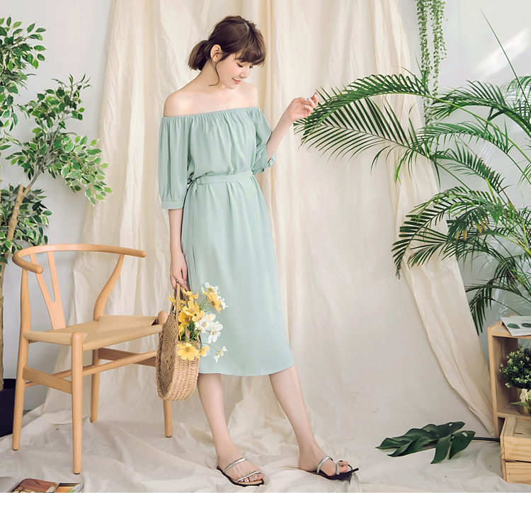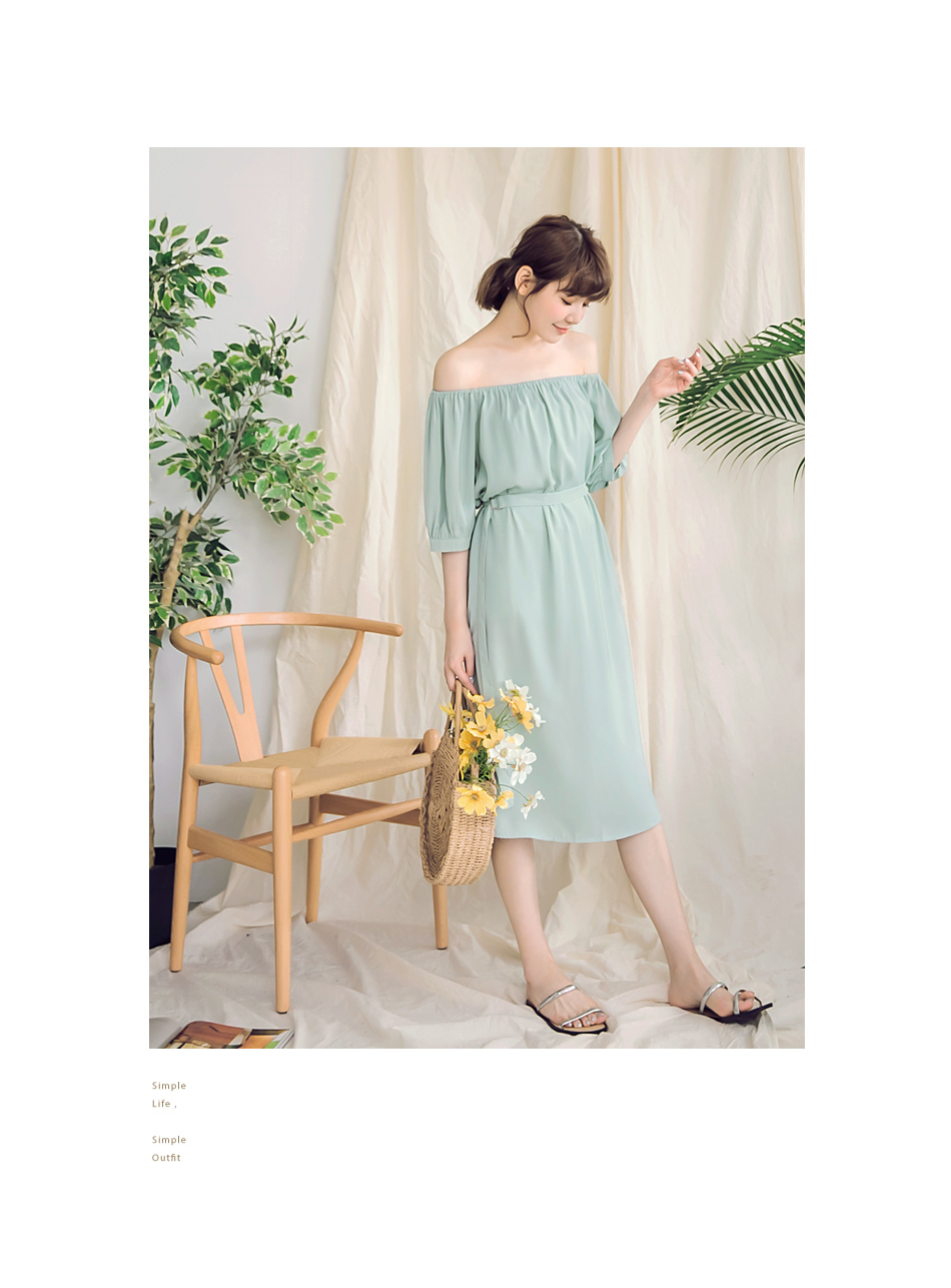 一字領設計露出肩頸線條,