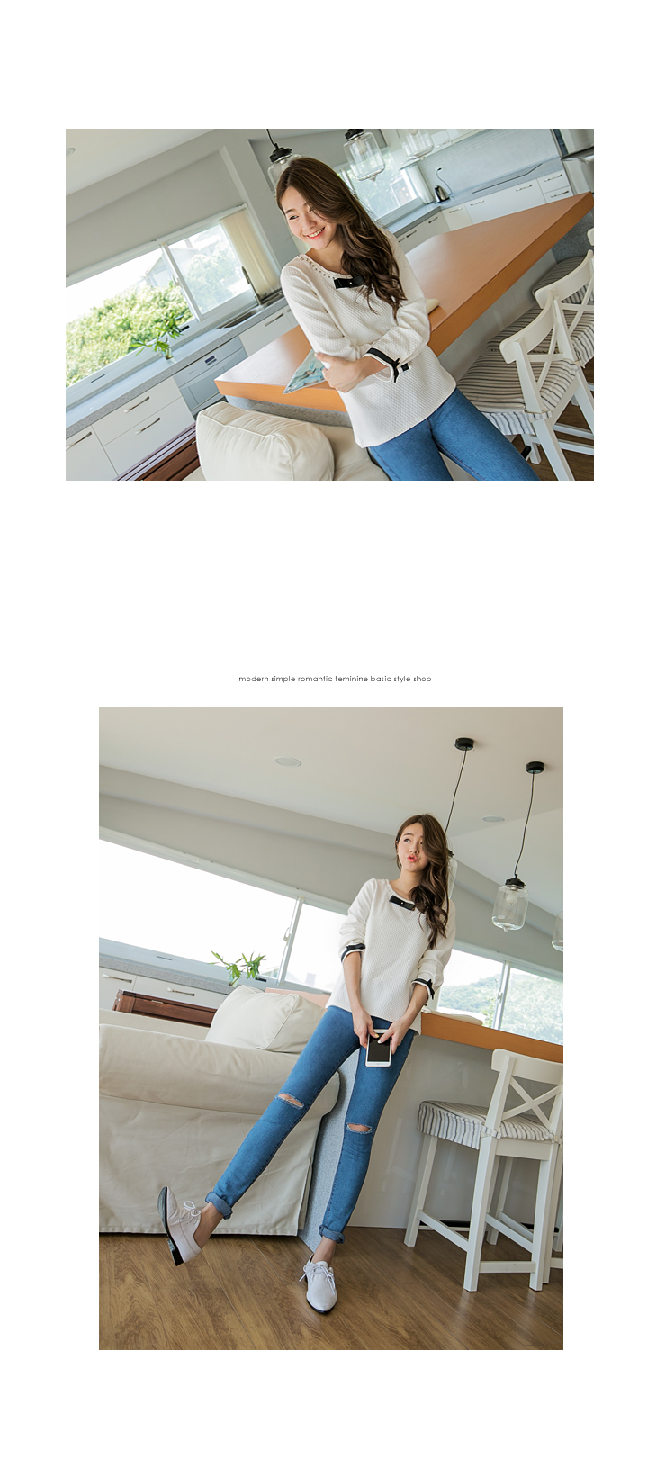 我要購買 微刷破的視覺設計,融入一點率性氛圍。 腰頭點綴上星星印圖創造出時髦個性, 局部刷紋,視覺上看起來有顯瘦的效果唷~~ 彈性牛仔布修飾出纖細的雙腿比例,無論什麼服裝都很適合搭配! ************ |  純真印象~小蝴蝶結可愛長頸路圖案T恤‧3色 售價:189